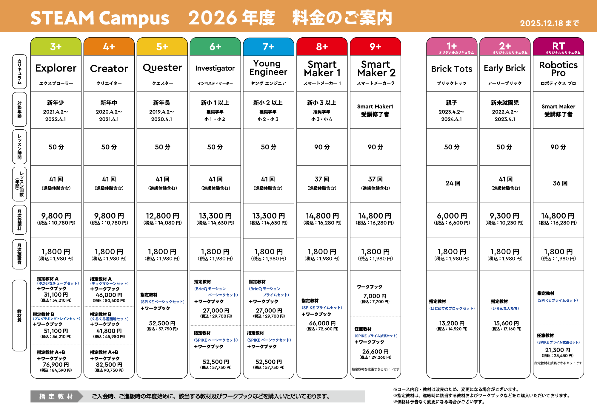 ※通年で指定教材「45678 LEGO Education SPIKEプライム 基本セット」をスクールに預けての受講となります。